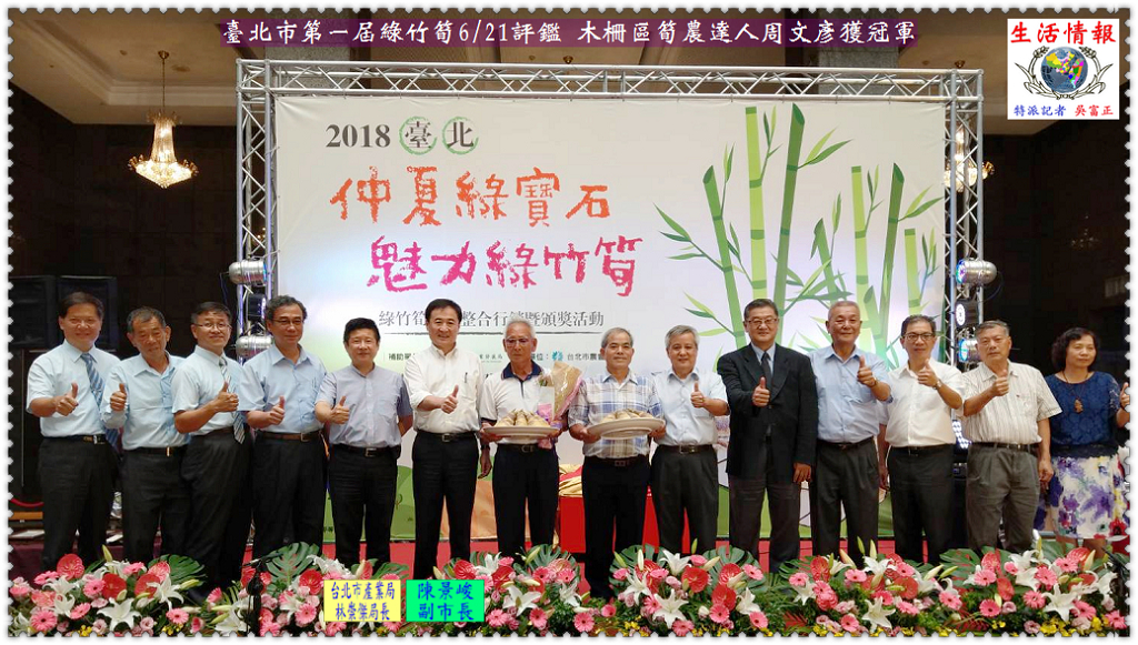 【生活情報-記者吳富正、湯佳寧/2018.06.21.台北報導】 114位筍農6/21上午在臺北市政府1樓中庭角逐第一屆綠竹筍評鑑的達人稱號,來自全市9區(木柵、士林、北投、內湖、景美、南港、大安、松山、中山)的筍農高手參賽,在經過一整個上午的評鑑,最終由木柵區的筍農周文彥獲得冠軍,而來自士林區的筍農何春生則獲得甜筍王的殊榮,另有亞軍、季軍及優良獎等獎項得主。