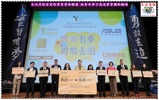 【生活情報-記者吳富正、湯佳寧/2018.02.25.台北報導】 台北市政府為協助青年學子透過實習轉銜職場,創全國之先推動「職場體驗實習策略聯盟」。為宣示聯盟成立,台北市鄧家基副市長、台北市政府勞動局賴香伶局長、台北就業服務處游淑眞處長2/25邀請聯盟企業代表於福華卓越堂舉辦啟動儀式及名人高峰論壇,在現場近千名青年的見證下,與台灣微軟、華碩電腦等九家企業代表共同舉起「實習直達就業」之高鐵車票,象徵策略聯盟主打的實習無縫接軌正職、畢業即就業的優勢。Life news 發表在 痞客邦 留言(0) 人氣(7)