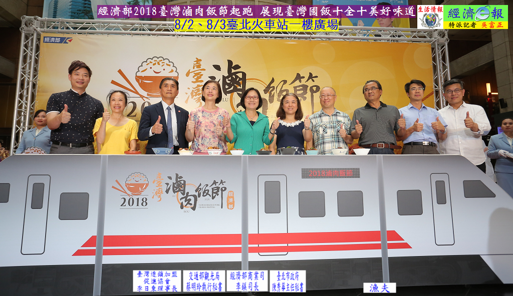 【生活情報*經濟e報-記者吳富正、湯佳寧/2018.08.02.台北報導】 「經濟部2018臺灣滷肉飯節」8/2在臺北火車站一樓廣場熱烈登場,總共精選出全臺104家獨具風味的極品滷肉飯業者,其中還有委員推薦「十全十美」全臺特色滷肉飯,有市場人氣滷肉飯、文化國粹滷肉飯、世紀飄香滷肉飯、時尚黑金滷肉飯、博士最愛滷肉飯、古早美味滷肉飯、港都手藝滷肉飯、享譽國際滷肉飯、南臺滋味滷肉飯、極品老灶滷肉飯,這麼多樣豐富的滷肉飯,就連食尚玩家當家主持人莎莎都來擔任國飯-滷肉飯代言人高喊“讚啦”。經濟部商業司李鎂司長、臺灣連鎖加盟促進協會李日東理事長、交通部觀光局蔡明玲執行秘書、臺北市政府陳秀華主任秘書、作家漁夫等貴賓,共同出席啟動儀式宣告活動正式開跑。