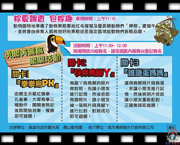 壽山動物園為慶祝端午節,於5/31上午舉辦「第二屆動物盃創意龍舟大賽」,比賽總獎金高達萬元,提前於網路報名者還可享有免費入園乙次及精美禮品;此外,當天還有動物保育推廣以鳥類為主題的闖關拿好禮活動,歡迎參與陸上龍舟裝扮、幫動物包粽子,與動物們一同度過一個寓教於樂的端午佳節。