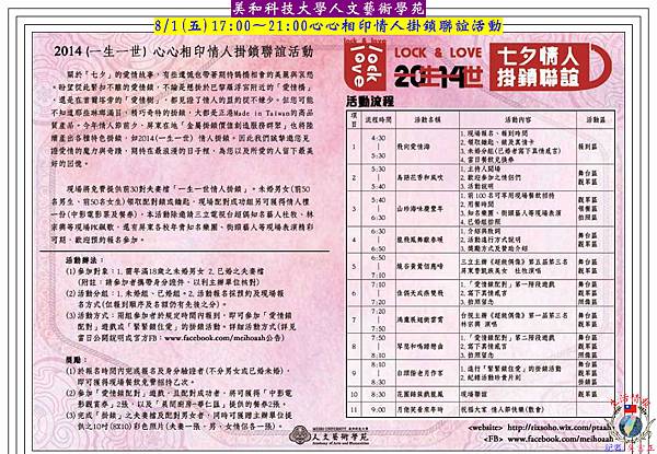 「七夕」即將到來,自古至今,天上人間的愛情故事從來不曾停止過,而不論是懸掛於巴黎羅浮宮附近的「愛情橋」,還是首爾塔旁的「愛情樹」,都見證了情人的盟約從不嫌少;但您可能不知道那些琳瑯滿目、精巧奇特掛鎖,大多是生根屏東已近60年的隆輝金屬製鎖公司所榮譽出品。今年情人節前夕,「隆輝」在經濟部中小企業處輔導下,由金屬工業中心專案協助產出的2014(一生一世) 情人掛鎖,全球首次發行就在台灣屏東;美和科技大學人文藝術學苑8/1(五)17:00~21:00將舉辦「情人掛鎖聯誼」活動,邀民眾見證愛情的魔力與奇蹟,期待在最浪漫的日子裡,為您及所愛的人留下最美好的回憶。