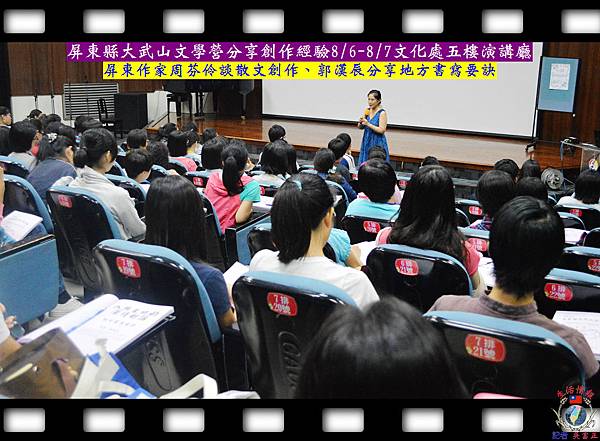 屏東縣大武山文學營8/6、8/7於文化處五樓演講廳登場,邀請作家從散文、小說、劇情故事等不同主題進行分享,近160位學員報名參加。8/6上午第一場由屏東作家周芬伶談散文創作表示,寫作就跟唱歌一樣,應該有自己的聲腔,拋棄模仿。寫作可從寫詩開始,「詩是養份,是對文字斤斤計較的文體」,她也建議,不要依賴任何成語或用別人的詞句,而是要「寫出自己的文字」。周芬伶提到「寫作是很有趣的」,鼓勵學員勇於挑戰、創新,每天都有新的想法,那才是創作。周芬伶提及在14歲時寫了第一篇散文<遺書>,是因當時病重父親留給她的一封遺書,第一次感到親人死亡的可能,學校老師將她的這篇文章發表於校刊,這也是她拿到的第一筆稿費。周芬伶認為,散文應寫真人實事,真實感情才能感動人心。