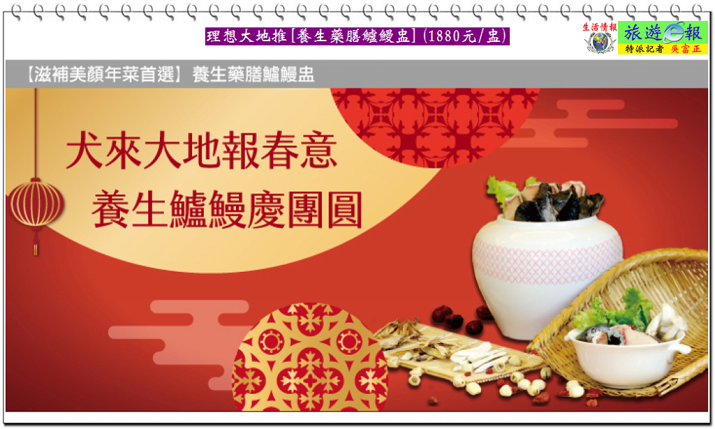 理想大地推[養生藥膳鱸鰻盅]除夕至初五「春節鱸鰻團圓宴」兩人同行,三天兩夜13500元
