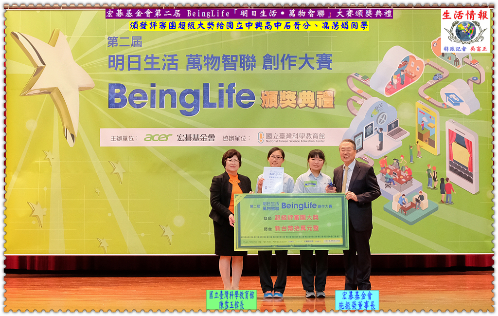 宏碁基金會和國立臺灣科學教育館共同舉辦第二屆 BeingLife「明日生活,萬物智聯」創作大賽,2/28於國立臺灣科學教育館舉行頒獎典禮,宏碁集團創辦人暨基金會施振榮董事長、國立臺灣科學教育館陳雪玉館長親臨現場授獎;為了鼓勵學生集思實作、動手研發產品,今年除延續第一屆「計劃書類」、「影片類」作品外,更增列創作實作組,讓學子們進一步思考使用者的實質需求和體驗。