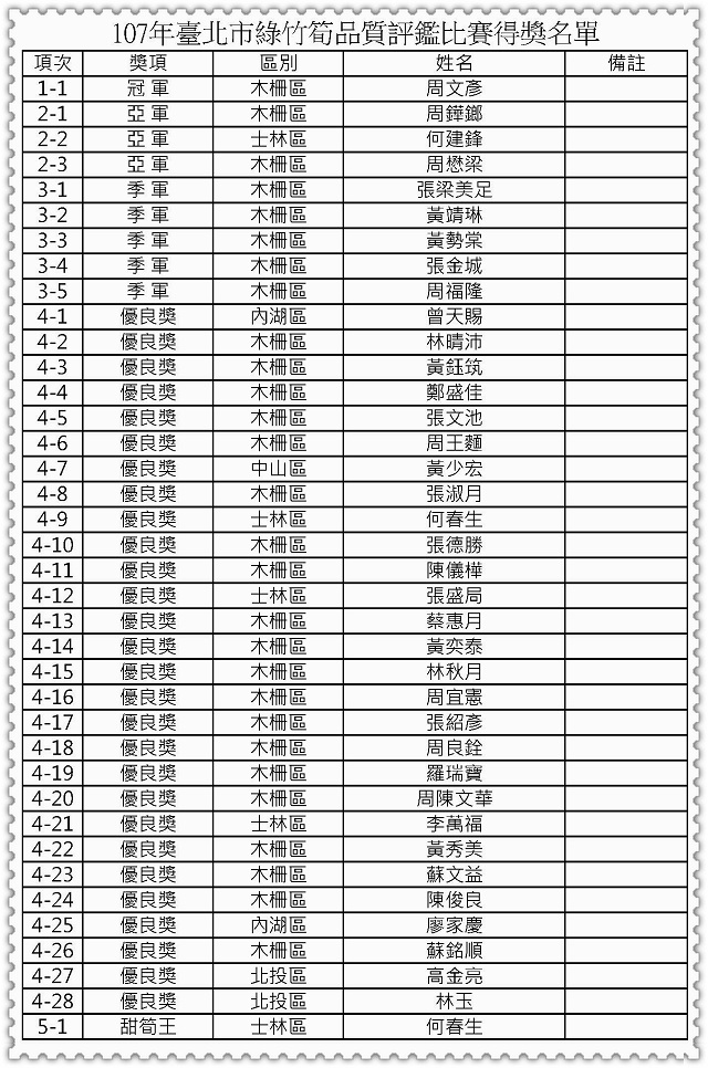 114位筍農6/21上午在臺北市政府1樓中庭角逐第一屆綠竹筍評鑑的達人稱號,來自全市9區(木柵、士林、北投、內湖、景美、南港、大安、松山、中山)的筍農高手參賽,在經過一整個上午的評鑑,最終由木柵區的筍農周文彥獲得冠軍,而來自士林區的筍農何春生則獲得甜筍王的殊榮,另有亞軍、季軍及優良獎等獎項得主。